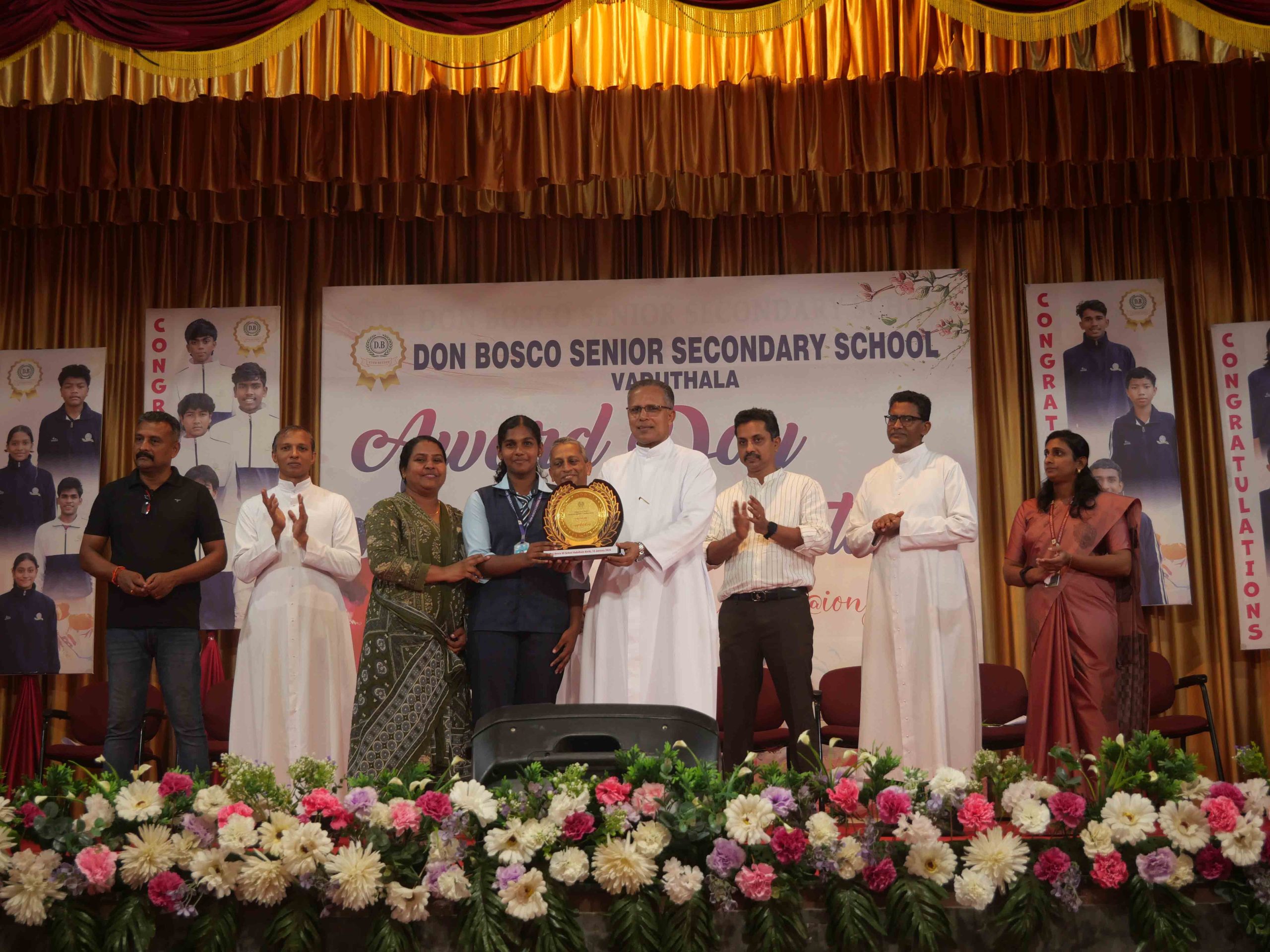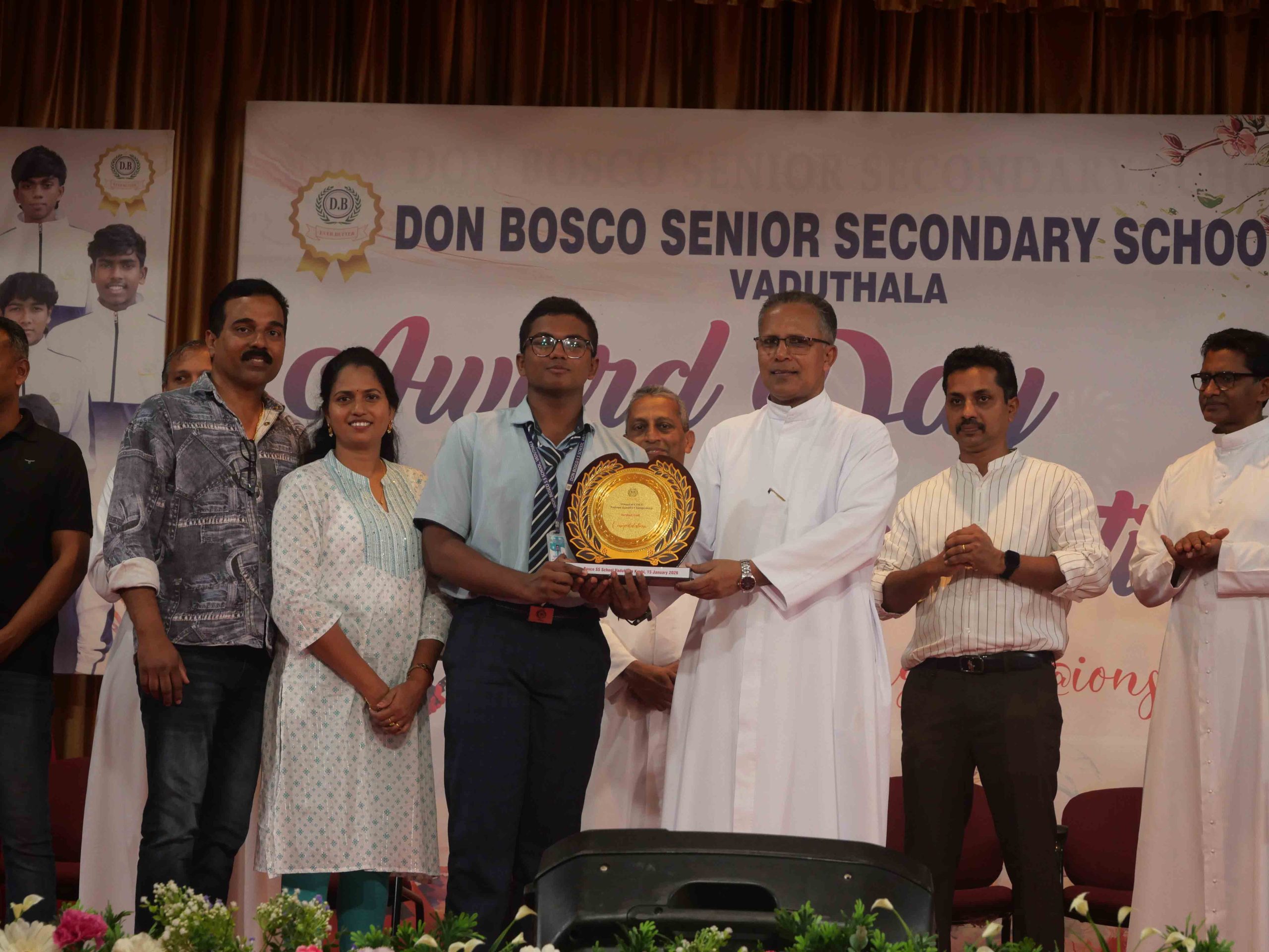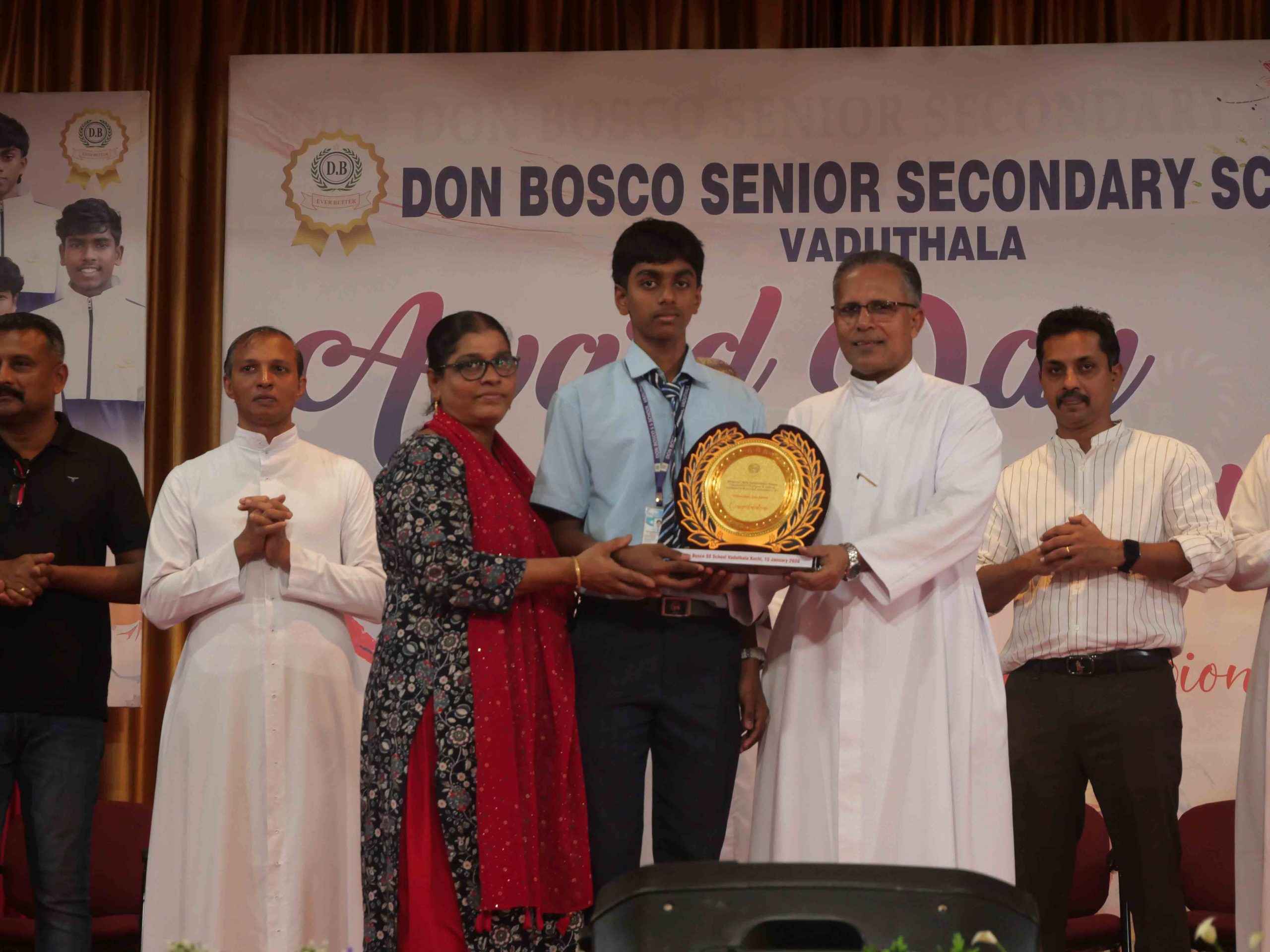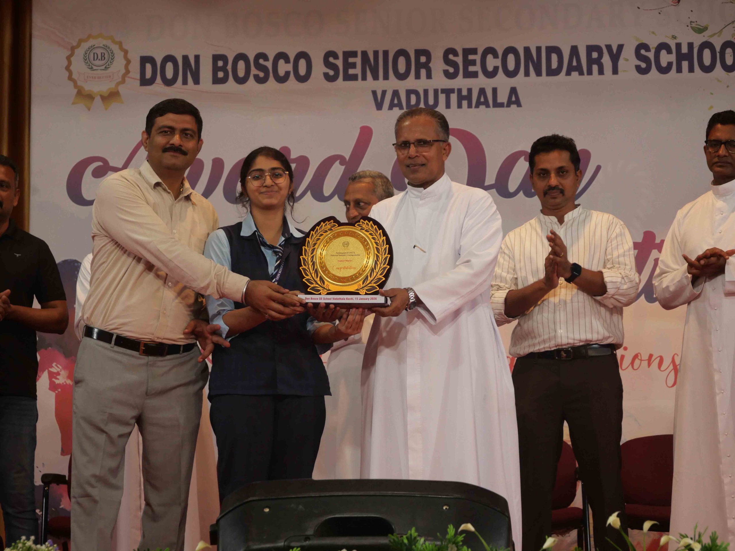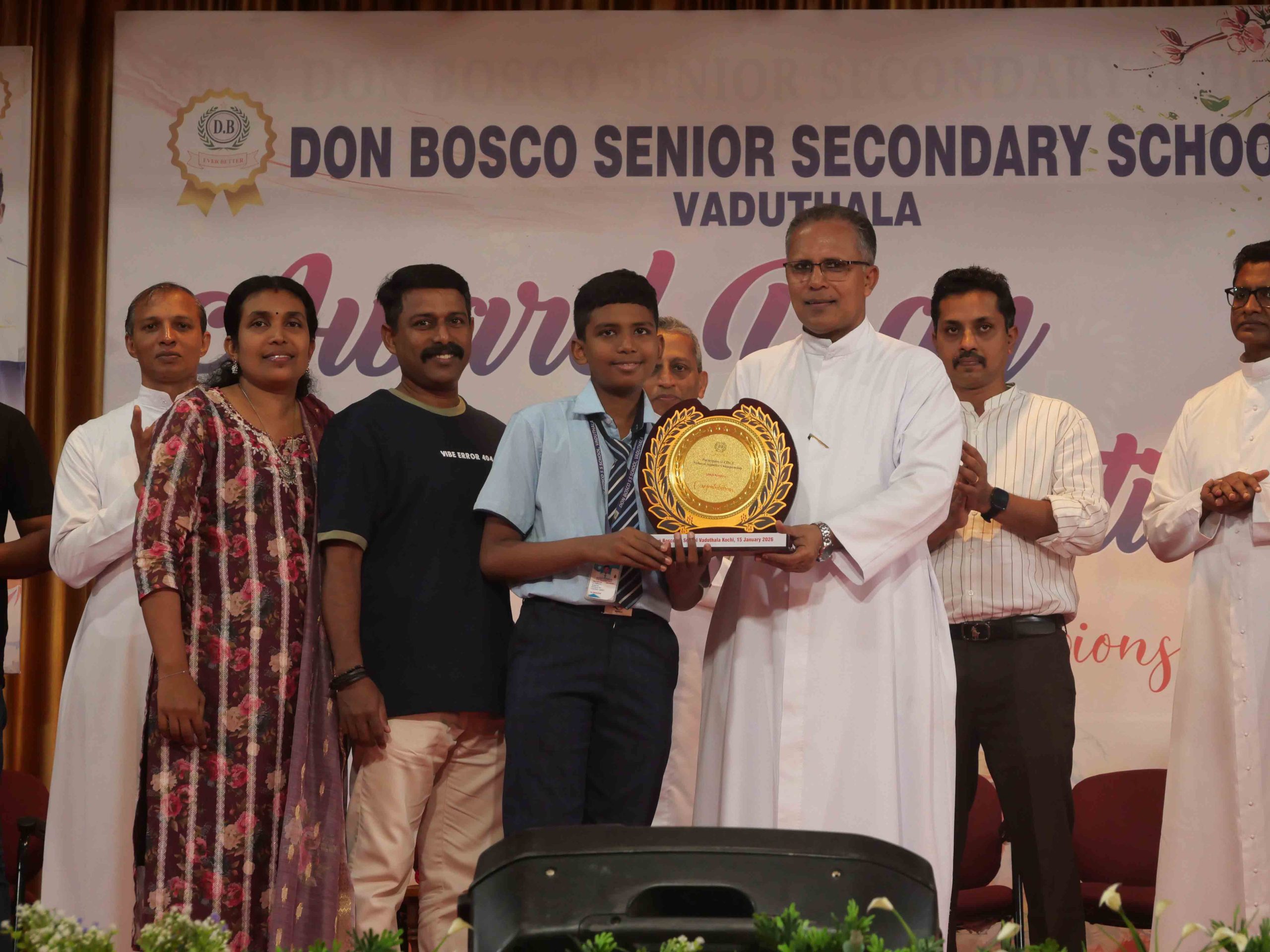 On January 15, 2026, at 10:15 AM, Don Bosco Senior Secondary School, Vaduthala, held its Award Day celebrations, an extra ordinary occasion to honour the outstanding sports and academic achievers in the presence of distinguished dignitaries such as Fr. Shibu Davis SDB (Rector & Manager), Fr. Kuriakose Shasthamkala SDB (Principal), Fr. Manuel Gilton SDB (Vice Principal), Fr.Joby Sebastian SDB (Administrator), Sri. Praveen Jolly (PTA President), Sri. Syamnadh G (School Coordinator), and Mrs. Shigi Varghese (Programme Coordinator).